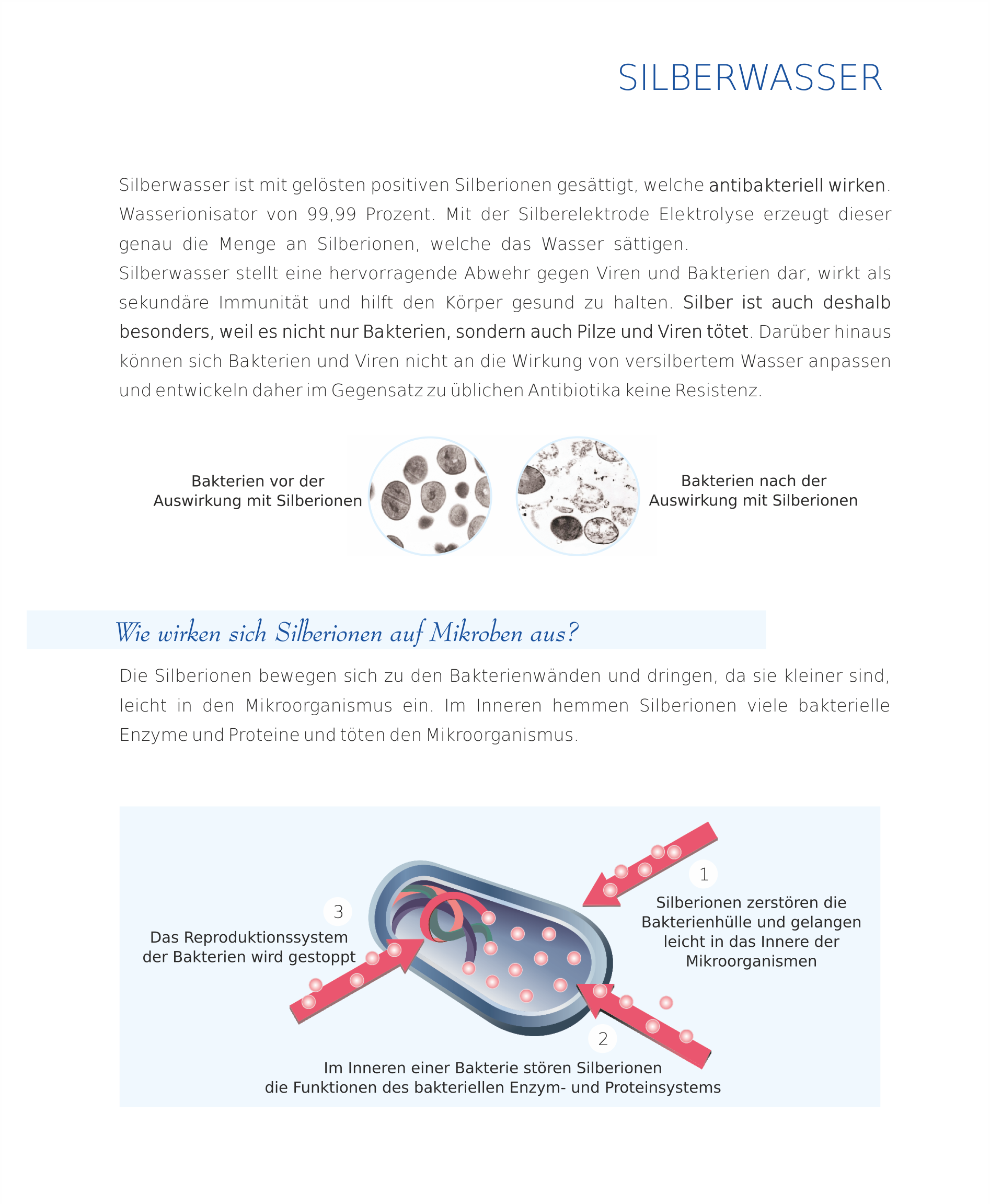 Silber ist auch deshalb besonders, weil es nicht nur Bakterien, sondern auch Pilze und Viren abtötet. Darüber hinaus können sich Bakterien und Viren nicht an die Wirkung von versilbertem Wasser anpassen und entwickeln daher im Gegensatz zu üblichen Antibiotika keine Resistenz.